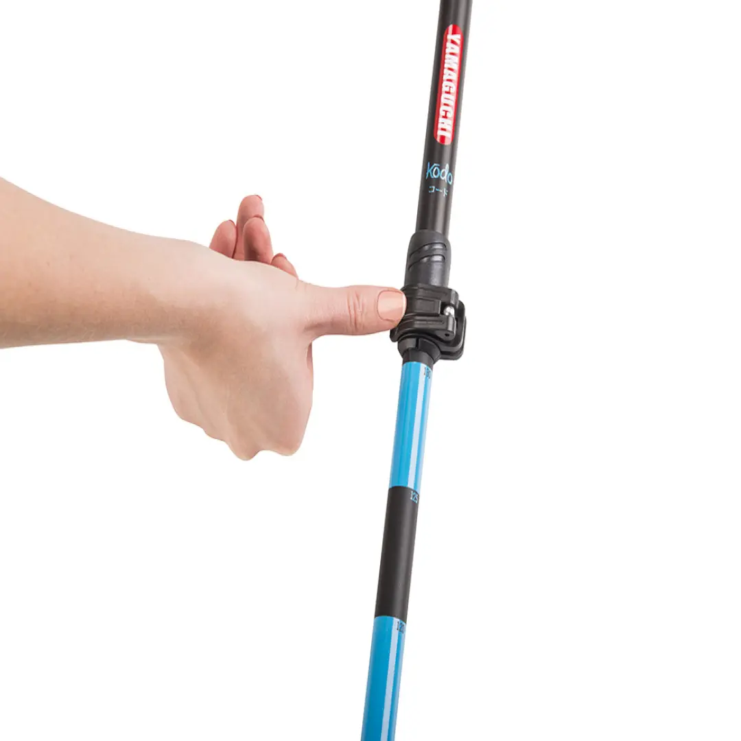 Yamaguchi Kodo имеют регулируемую конструкцию. Их можно использовать людям с ростом от 160 до 195 см. За счет трехсекционной телескопической конструкции и нанесенной сантиметровой шкалы на корпус их просто отрегулировать, установить необходимую высоту. Рукоятка изготавливается из армированного пластика, есть два съемных наконечника, по кисти регулируется за счет ремешка «капкан» - скандинавский темляк.